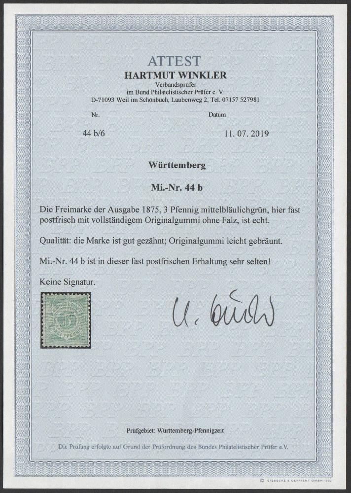 | Zusatzinformationen und Suchstichworte: | 108. Briefmarken Lenz Auktion Auktionstermin: 29. April - 5. Mai 2022 Los 6002 Altdeutschland Württemberg 1875, 3 Pf. mittelbläulichgrün, fast postfrisch mit Originalgummi(für xx 1.400,-), in dieser Erhaltung sehr selten, Attest Winkler Ausruf 400,00 EUR |