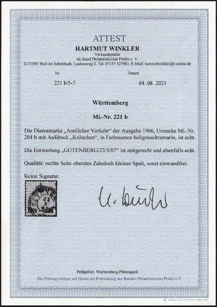 | Zusatzinformationen und Suchstichworte: | 108. Briefmarken Lenz Auktion Auktionstermin: 29. April - 5. Mai 2022 Los 6082 Altdeutschland Württemberg 1906, 20 Pfg. hellgrauultramarin, Kabinettstück mit Kreuzerzeit-Doppelkreisst. "GUTENBERG", Attest Winkler, Mi.900,- Ausruf 200,00 EUR |