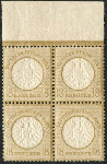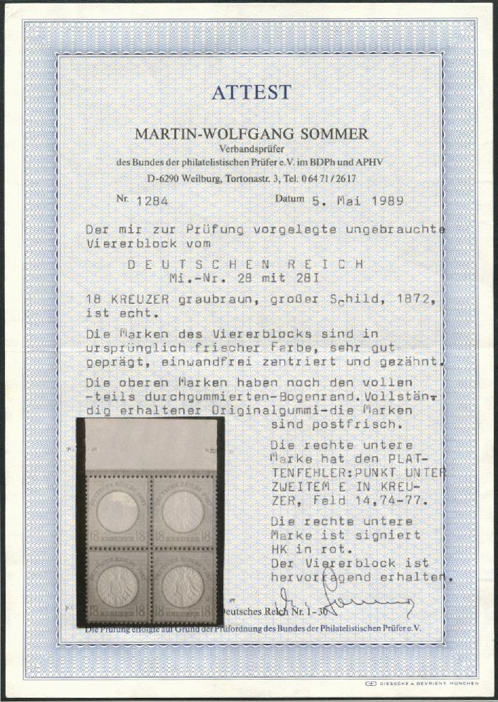| Zusatzinformationen und Suchstichworte: | 108. Briefmarken Lenz Auktion Auktionstermin: 29. April - 5. Mai 2022 Los 6550 Deutsches Reich, 1872 Grosser Brustschild 1872, 18 Gr. graubraun, VB mit Oberrand, untere rechte Marke mit Plattenfehler "Punkt unter E", Echt und hervorragend erhalten, Attest Sommer Ausruf 600,00 EUR |