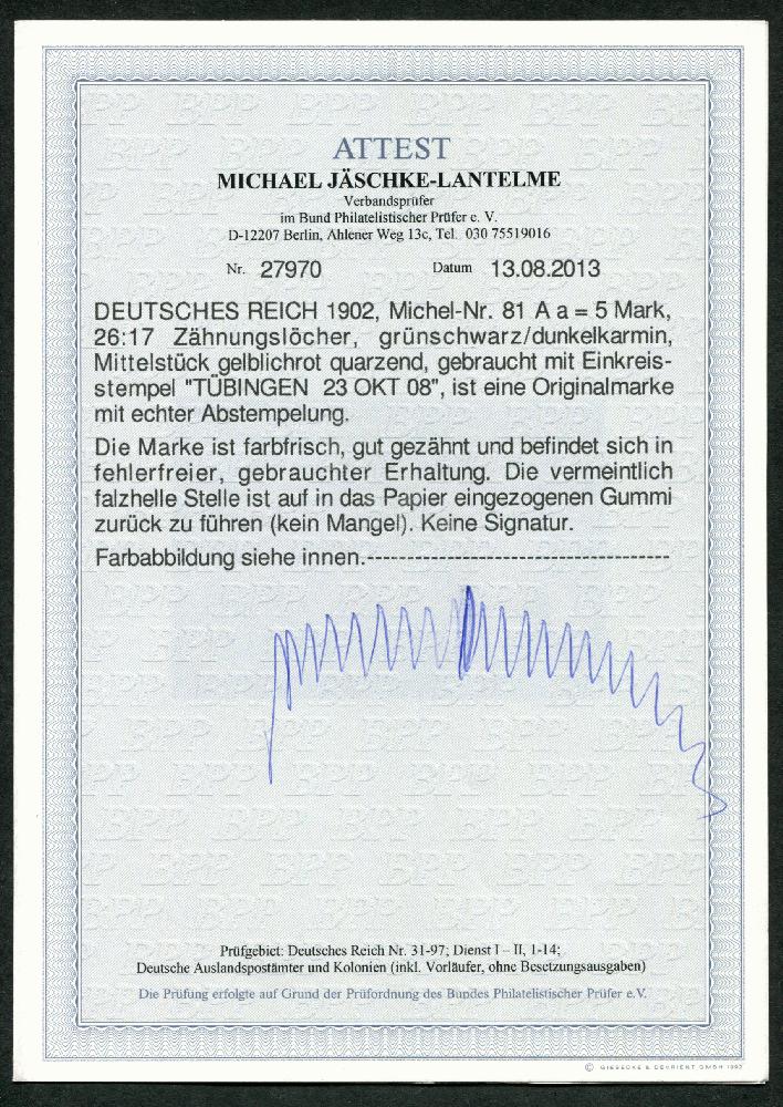| Prüfer: | Jäschke-Lantelme, Michael (BPP (Bund Philatelistischer Prüfer)) |