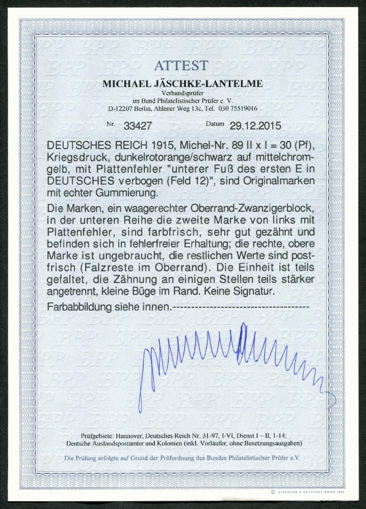 | Prüfer: | Jäschke-Lantelme, Michael (BPP (Bund Philatelistischer Prüfer)) |