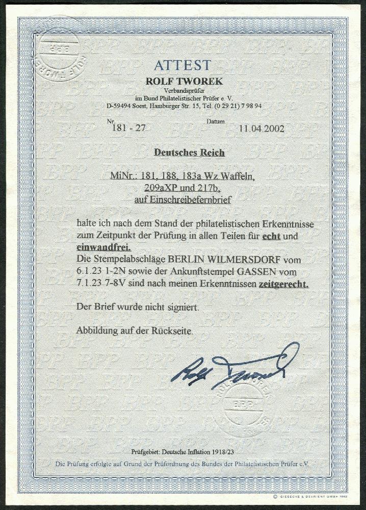 | Prüfer: | Tworek, Rolf (BPP (Bund Philatelistischer Prüfer)) |
