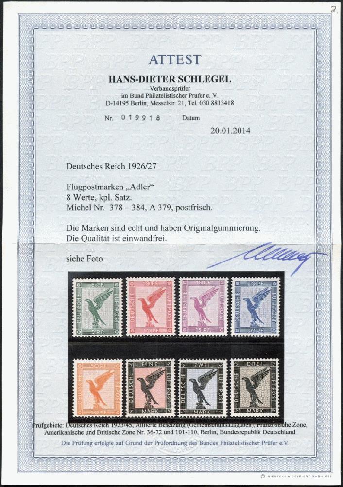 | Zusatzinformationen und Suchstichworte: | 108. Briefmarken Lenz Auktion Auktionstermin: 29. April - 5. Mai 2022 Los 6823 Deutsches Reich, 1923/32 Weimarer Republik 1926, Flugpost Adler, Serie kpl. mit Attest Schlegel 2014, die Qualität ist einwandfrei, Mi.1200,- Zuschlag 240,00 EUR |