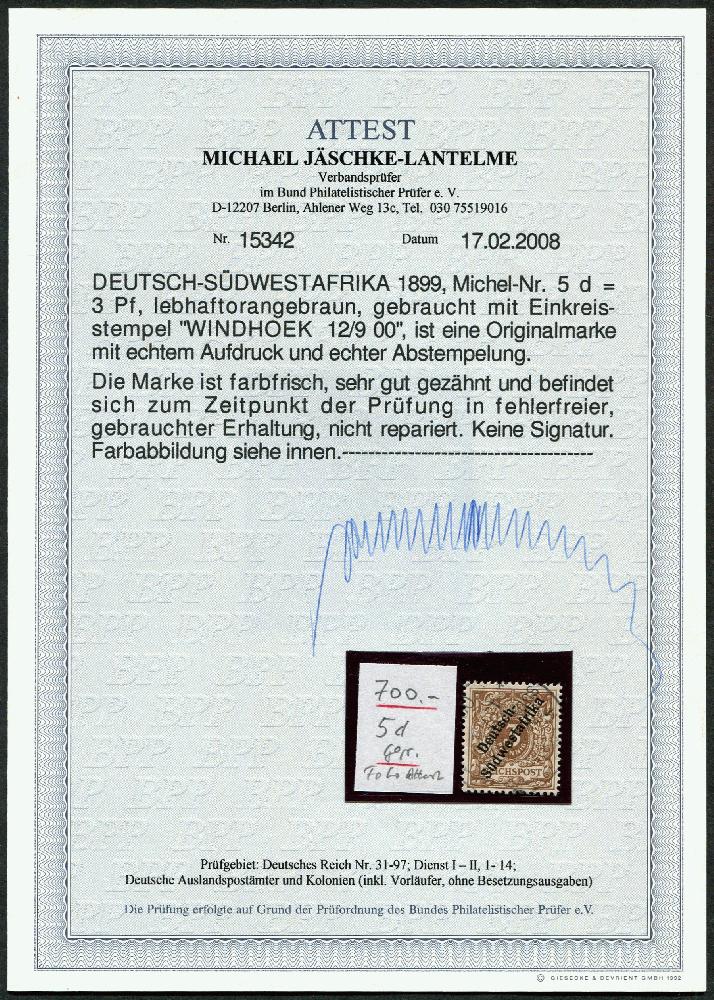 | Zusatzinformationen und Suchstichworte: | 108. Briefmarken Lenz Auktion Auktionstermin: 29. April - 5. Mai 2022 Los 7600 Deutsche Kolonien Südwestafrika 1899, 3 Pf. lebhaftorangebraun, Stempel "Windhoek 12/9 00", farbfrisch, sehr gut gezähnt, Echt und Fehlerfrei, Attest Jäschke-Lantelme, Mi.650-, Zuschlag 140,00 EUR |