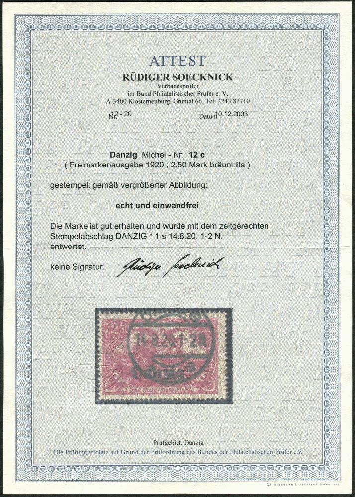| Zusatzinformationen und Suchstichworte: | 108. Briefmarken Lenz Auktion Auktionstermin: 29. April - 5. Mai 2022 Los 7676 Danzig 1920, 2,50 M. bräunlichlila, zeitgerecht gestempelt mit Vollstempel, Echt und Einwandfrei, Attest Soecknick, Mi.900,- Ausruf 160,00 EUR |