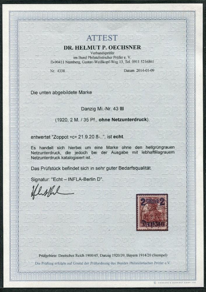 | Zusatzinformationen und Suchstichworte: | 108. Briefmarken Lenz Auktion Auktionstermin: 29. April - 5. Mai 2022 Los 7685 Danzig 1920, 2 M. Freimarke, ohne Netzunterdruck, gestempelt "Zoppot 21.9.20", Echt und in sehr guter Bedarfsqualität, Attest Oechsner, Mi.1.200,- Ausruf 180,00 EUR |