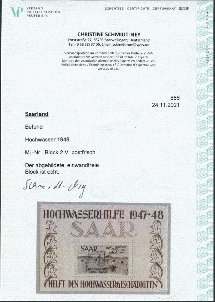 | Zusatzinformationen und Suchstichworte: | 108. Briefmarken Lenz Auktion Auktionstermin: 29. April - 5. Mai 2022 Los 7759 Saargebiet 1948, Hochwasserhilfe Block, Echt und Einwandfrei, Attest Ney VPP, Mi.600,- Ausruf 200,00 EUR |