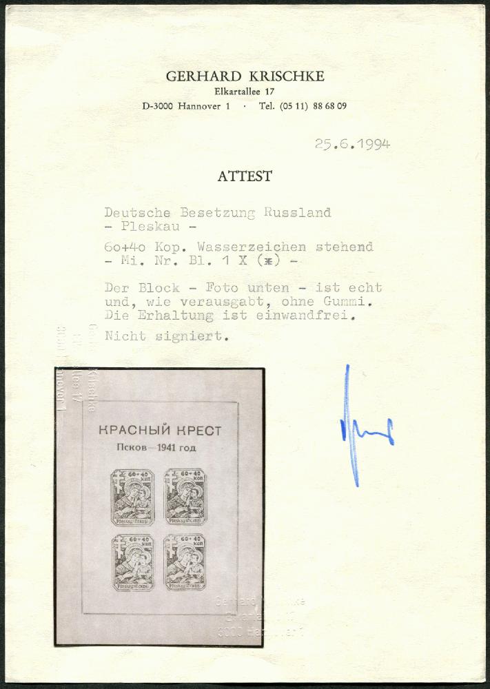 | Zusatzinformationen und Suchstichworte: | 108. Briefmarken Lenz Auktion Auktionstermin: 29. April - 5. Mai 2022 Los 7829 Deutsche Besetzung II. WK Russland - Pleskau 1941, Hilfe für Stadtkindergärten, Block mit WZ stehend, wie verausgabt ohne Gummi, Echt und Einwandfrei, Attest Krischke, Mi.1.700,- Zuschlag 520,00 EUR |
