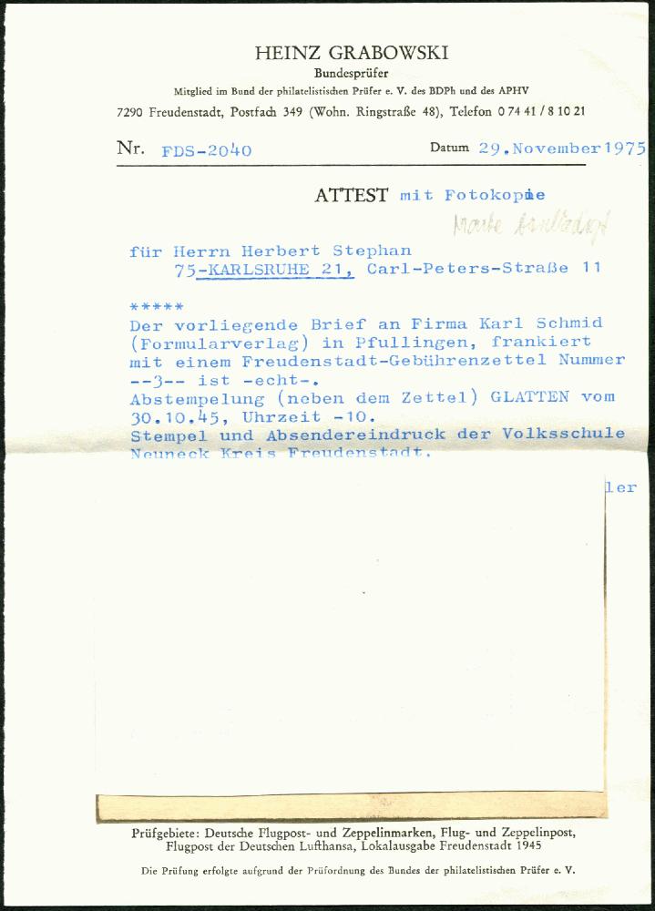 | Prüfgebiet: | Deutsche Lokalausgaben 1945 Freudenstadt |
