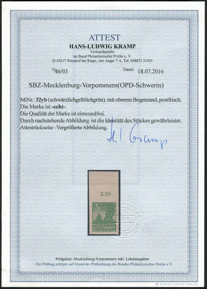 | Zusatzinformationen und Suchstichworte: | 108. Briefmarken Lenz Auktion Auktionstermin: 29. April - 5. Mai 2022 Los 8325 Sowjetische Zone 1946, 5 Pf. schwärzlichgelblichgrün, mit Oberrand, Echt und Einwandfrei, Attest Kramp, Mi.1.000,- Ausruf 240,00 EUR |