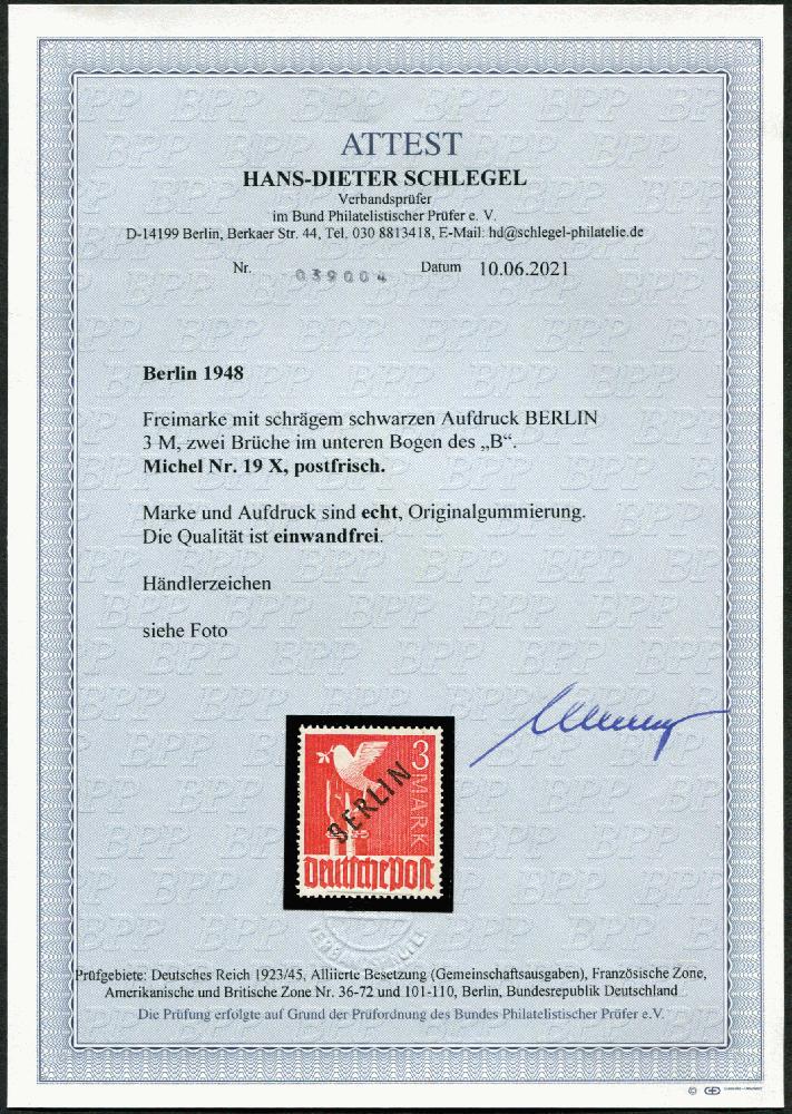 | Zusatzinformationen und Suchstichworte: | 108. Briefmarken Lenz Auktion Auktionstermin: 29. April - 5. Mai 2022 Los 8648 Berlin 1948, 3 M. Schwarzaufdruck, mit Aufdruckfehler "2 Brüche in B", Echt und Einwandfrei, Attest Schlegel, Mi.750,- Ausruf 120,00 EUR |