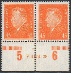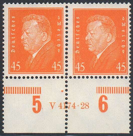 | Zusatzinformationen und Suchstichworte: | Uwe von Poblocki Los 0948702806 Deutsches Reich, 1923/32 Weimarer Republik 1928, 45 Pf Hindenburg im postfrischen Unterrandpaar mit HAN "V 4174.28", ungegefaltet und unsigniert mit Fotoattest A.Schlegel BPP "einwandfrei" Festpreis 195,00 EUR |