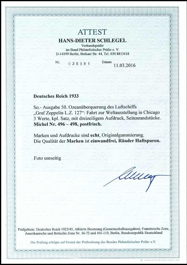 | Zusatzinformationen und Suchstichworte: | Dr. Reinhard Fischer 186. Auktion Auktionstermin: 18. - 21. Mai 2022 Los 2031 Deutsches Reich, 1933/45 Drittes Reich 1 - 4 RM Chicagofahrt, 3 Werte komplett, tadellos postfrisch, unsigniert, Fotoatteste H.-D. Schlegel BPP (2000 und 2016): "...postfrisch. Marken und Aufdrucke sind echt, Originalgummierung. Die Qualität der Marken ist einwandfrei.", Mi. 4.300.- (Hinweis: Beide Atteste für den Satz wurden mit anhängenden Seitenrändern ausgestellt, die aufgrund von Haftspuren vom Sammler entfernt wurden.) Ausruf 1.500,00 EUR |