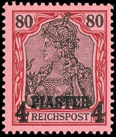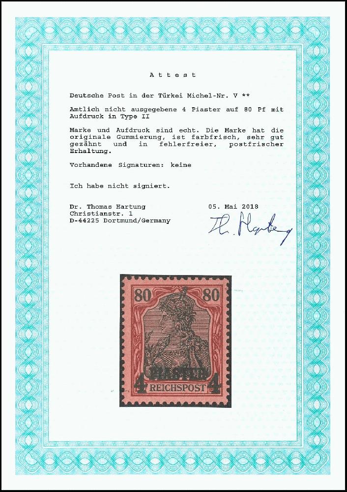 | Zusatzinformationen und Suchstichworte: | Dr. Reinhard Fischer 186. Auktion Auktionstermin: 18. - 21. Mai 2022 Los 2426 Deutsche Auslandspost Türkei 4 Piaster auf 80 Pf amtlich nicht ausgegeben (Aufdruck in Type II) tadellos postfrisch, Attestkopie Jäschke-Lantelme BPP (für 4er-Block): "sehr gut gezähnt und in fehlerfreier, postfrischer Erhaltung und gleichlaufendes Attest Dr. Hartung, Mi. 750,-- Ausruf 150,00 EUR |