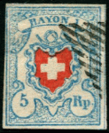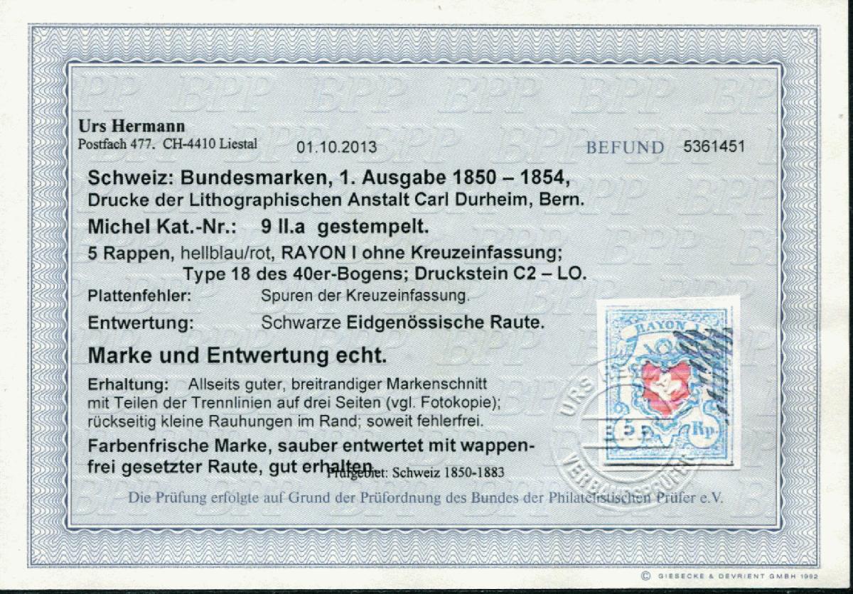 | Zusatzinformationen und Suchstichworte: | 108. Briefmarken Lenz Auktion Auktionstermin: 29. April - 5. Mai 2022 Los 2024 Schweiz 5 Rp. Rayon I, Type 18, Druckstein C2-LO, breitrandig mit Teilen der Trennlinien an 3 Seiten, PF "Spuren der Kreuzeinfassung", gest. schwarze Raute, gute Erhaltung, siehe Befund Hermann 2013 Zuschlag 40,00 EUR |