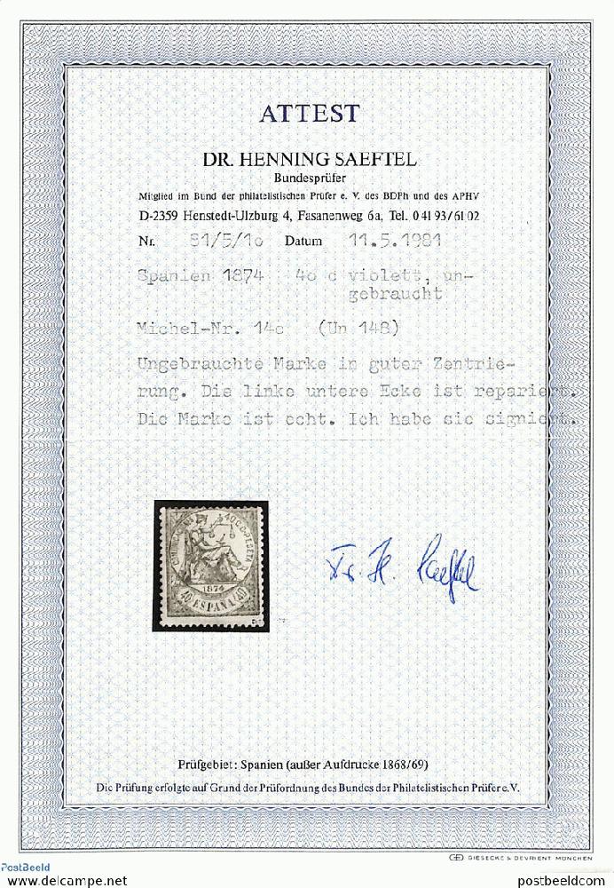 | Zusatzinformationen und Suchstichworte: | Delcampe.net Spain 1874 40c violet, unused, rep. corner, with attest, Unused (hinged) Artikel n° #1559001727 Festpreis 125,00 EUR |