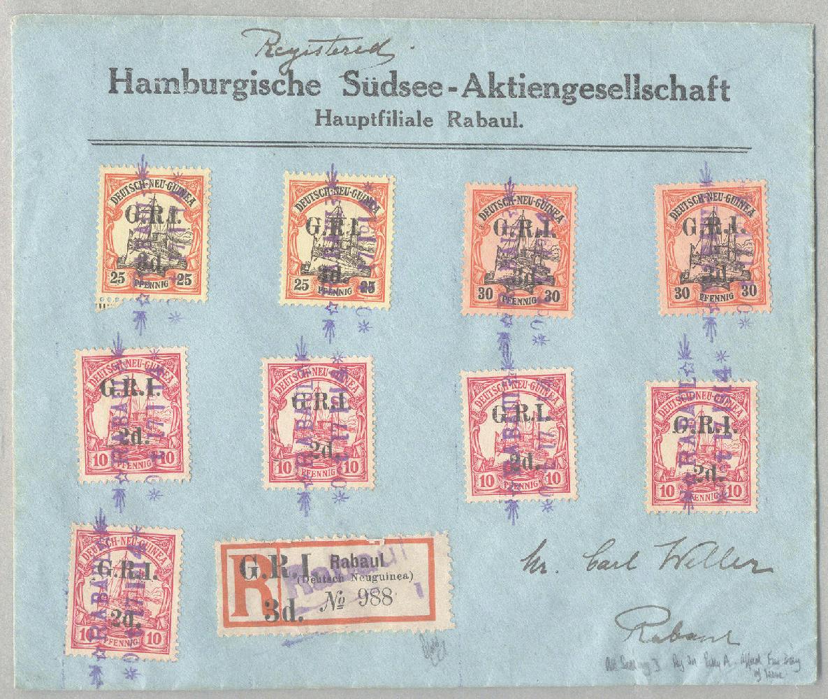 | Zusatzinformationen und Suchstichworte: | 11. classicphil GmbH Auktion Auktionstermin: 28. Mai 2022 Los 1001 Deutsche Kolonien Neuguinea Britische Besetzung 1914, Einschreiben Ersttag - Weller - Brief aus RABAUL, mit 2 d. auf 10 Pf. karmin (5) und 3 d. auf 25 Pf. (2) und 3 d. auf 30 Pf. (2), 3 d. auf 25 Pf. von Fassung 1, Pos. 10 - Abart 1 statt I, alle entwertet mit violettem RABAUL Oct. 17/14, Stempel (Gibbs Typ 2), die 3d Einschreibezettel wurde später hinzugefügt und gestempelt mit Typ 5 RABAUL, ein einmaliger Brief in beeindruckend perfektem Zustand, ausführliches Attest Holcombe mit Plattierung, XF-SUP! Schätzpreis 8,000 EUR Zuschlag 4200,00 EUR |
