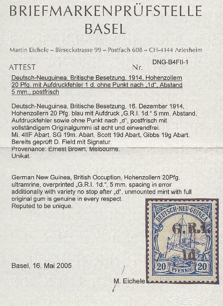 | Zusatzinformationen und Suchstichworte: | 11. classicphil GmbH Auktion Auktionstermin: 28. Mai 2022 Los 1003 Deutsche Kolonien Neuguinea Britische Besetzung 1914,1 d. auf 20 Pf. blau, New-Guinea Briefmarke, mit schwarz G. R. I./1 d Aufdruck statt 2 d. und Abart ohne Punkt nach dem d, Zeilen mit 5 mm Abstand, großer Teil Originalgummi, gelistet in Gibbs auf Seite 79, Gibbs 16g Abart, Michel 4IIF Abart, Attest Eichele 2005, Provenienz Ernest Brown, Melborne, signiert D. Field, außergewöhnliche einmalige Weltrarität, Fehler und Abart nicht zusammen im SG notiert, CV £13000 für ungebraucht Fehler, VF-XF! Schätzpreis 15,600 EUR. Zuschlag 5.000,00 EUR |