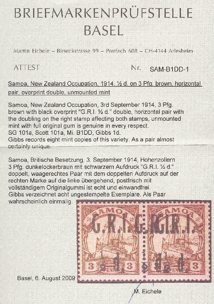 | Zusatzinformationen und Suchstichworte: | 11. classicphil GmbH Auktion Auktionstermin: 28. Mai 2022 Los 1021 Deutsche Kolonien Samoa Brit. Besetzung 1914,1/2 d. auf 3 Pf. braun, Paar, Samoa Briefmarken, mit doppeltem schwarzem G. R. I./1/2 d. auf rechte Marke führt zu 3 Aufdrucke. Auf das Paar, Gibbs listet 8 ungebraucht Exemplaren - auf ein Paar außerordentlich selten, postfrisch mit vollem Originalgummi, gelistet in Gibbs auf Seite 266, Gibbs 1d, Michel B1DD, Attest Eichele 2009, einmalig Paar, besonders frisch und in perfektem Zustand, CV £1500 + + für ungebraucht laut SG, SUP! Schätzpreis 1,800 EUR. Zuschlag 400,00 UER |