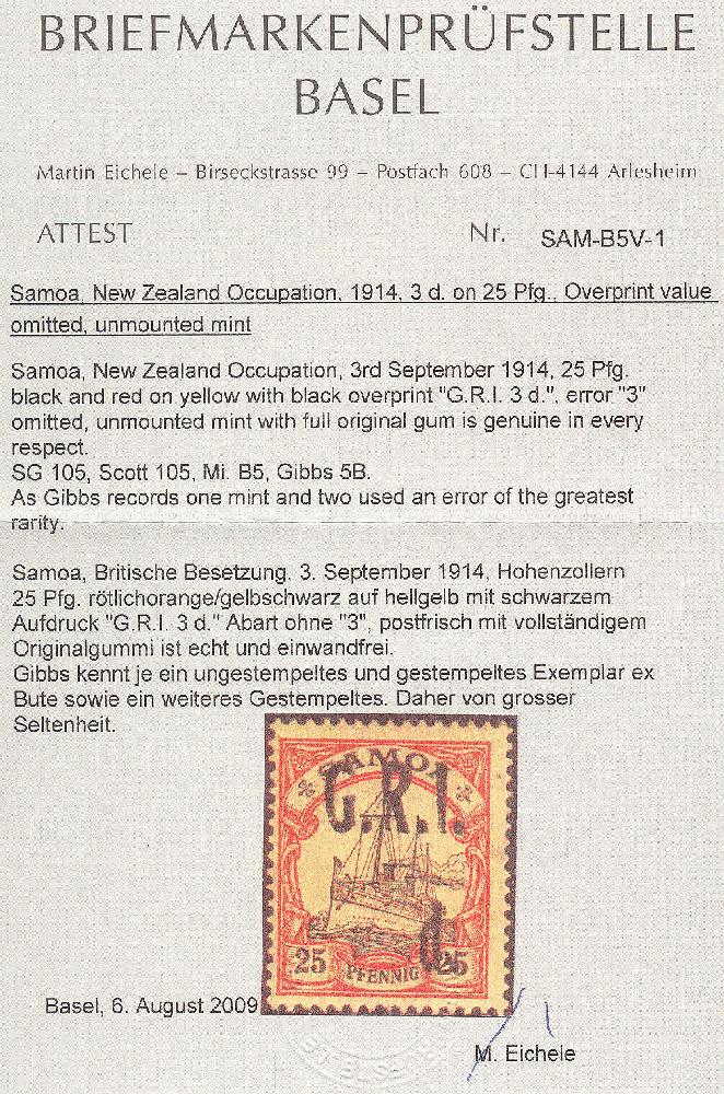 | Prüfgebiet: | Deutsche Kolonien Samoa Britische Besetzung |