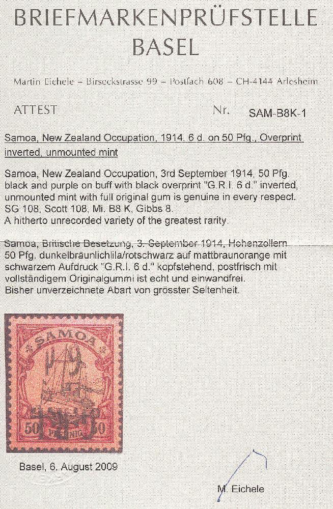 | Zusatzinformationen und Suchstichworte: | 11. classicphil GmbH Auktion Auktionstermin: 28. Mai 2022 Los 1031 Deutsche Kolonien Samoa Brit. Besetzung 1914,6 d. auf 50 Pf. schwarz und purpur auf sämisch, Samoa Briefmarke, mit unbefugt kopfstehend schwarz G. R. I./6 d. Aufdruck, nicht notiert in Gibbs, postfrisch mit vollem Originalgummi, 6 d Listungen in Gibbs auf Seite 271, Gibbs (8), Michel B8, Attest Eichele 2009, möglicherweise einmalig, hervorragend Weltrarität, außergewöhnlich frisch und perfekte Erhaltung, nicht notiert in SG, SUP! Schätzpreis 3,000 EUR. Ausruf 600,00 EUR |