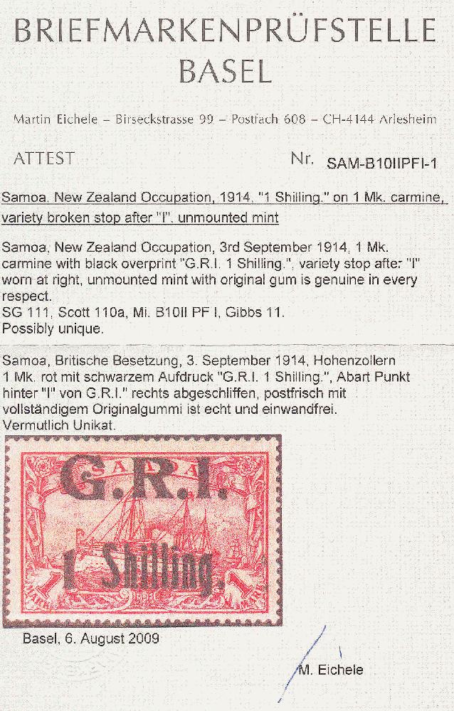 | Prüfgebiet: | Deutsche Kolonien Samoa Britische Besetzung |
