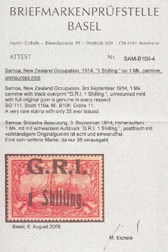 | Zusatzinformationen und Suchstichworte: | 11. classicphil GmbH Auktion Auktionstermin: 28. Mai 2022 Los 1034 Deutsche Kolonien Samoa Brit. Besetzung 1914,1 s. Auf 1 Mk. karmin, Samoa Briefmarke, mit schwarz G. R. I./1 Schilling. Aufdruck, nur 35 überhaupt verausgabtes, ungebraucht mit vollem Originalgummi, 1 s. Listungen in Gibbs auf Seite 271, Gibbs 11, Michel B10II, Attest Eichele 2009, besonders frisch und perfekte Erhaltung, CV £11000 zu SG, SUP! Schätzpreis 13,200 EUR. Ausruf 2.800,00 EUR |