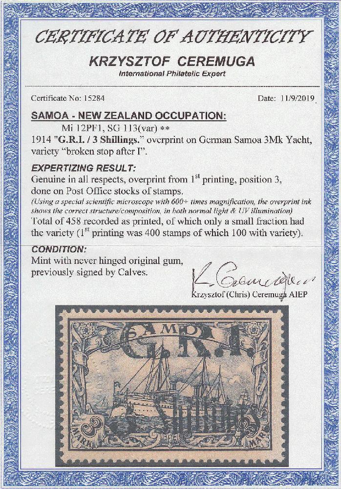 | Zusatzinformationen und Suchstichworte: | 11. classicphil GmbH Auktion Auktionstermin: 28. Mai 2022 Los 1038 Deutsche Kolonien Samoa Brit. Besetzung 1914,3 s. Auf 3 Mk. blau, Samoa Briefmarke, mit schwarz G. R. I./3 Schillinge. Aufdruck, Erstauflage, Position 3, Abart mit durchbrochen Punkt nach I, selten, postfrisch postfrisch, nur 458 verausgabtes und 100 mit dieser Abart, nicht notiert in Gibbs, 3 s. Listungen in Gibbs auf Seite 271, Gibbs (13), Michel B12 PF I, Attest Ceremuga 2019, signiert Calves, selten Briefmarke mit interessante Abart, außerordentlich frisch und perfekte Erhaltung, CV Mindest £3000 als nicht notiert in SG, SUP! Schätzpreis 3,600 EUR Ausruf 850,00 EUR |