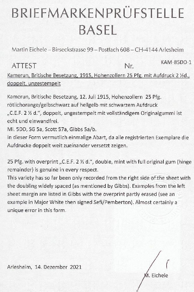 | Zusatzinformationen und Suchstichworte: | 11. classicphil GmbH Auktion Auktionstermin: 28. Mai 2022 Los 1039 Deutsche Kolonien Kamerun Britische Besetzung 1915,2 1/2 d. auf 25 pfg. Schwarz und rot/gelb, mit schwarz C. E. F./2 1/2 d. Doppelaufdruck großer Teil Originalgummi, dieses Abart hat bisher gewesener nur verzeichnet mit ein breiterem gesperrt Ausgabe, dieses ist nicht Teil der Zehnerstreifen welches ist angegeben bei Gibbs/Blatt 220, ein sehr begehrenswert Paradestück für den Spezialisten, Attest Eichele, VF-XF! Schätzpreis 15,600 EUR. Ausruf 2.400,00 EUR |