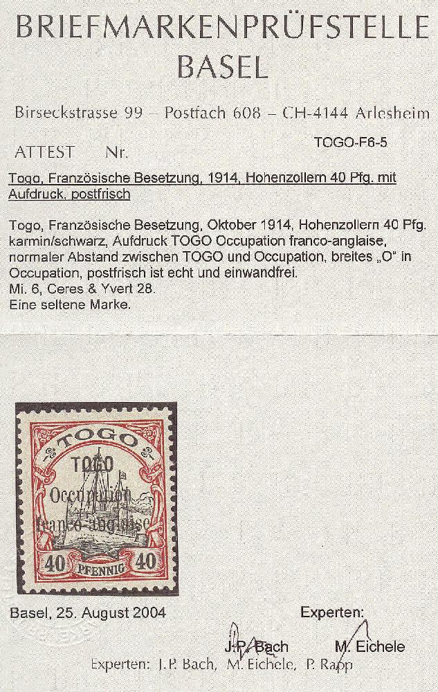 | Prüfgebiet: | Deutsche Kolonien Togo Französische Besetzung |