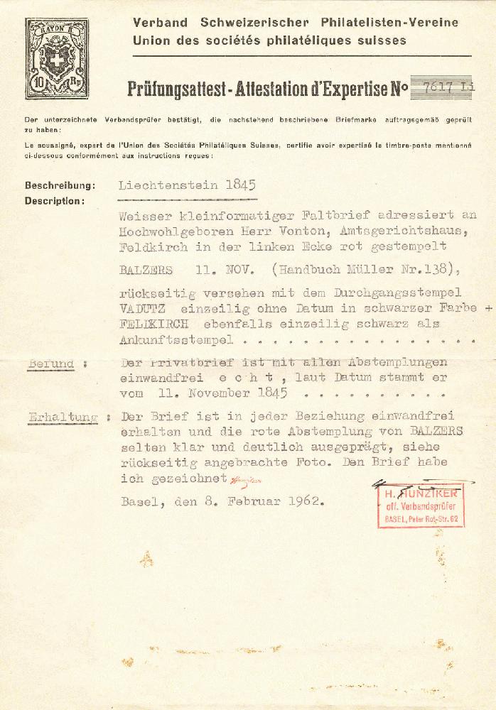| Zusatzinformationen und Suchstichworte: | 11. classicphil GmbH Auktion Auktionstermin: 28. Mai 2022 Los 1054 Liechtenstein1845, Brief mit vollem Inhalt von BALZERS nach FELDKIRCH, vorderseitig wurde der Brief mit dem orangeroten Antiqua Zweizeiler BALZERS 11. NOV, rückseitig trägt der Privatbrief auf der rechten Klappe den Transitstempel VADUZ und auf der linken Klappe den Einzeiler FELDKIRCH als Ankunftsstempel, ex Künzi, Attest Puschmann, Prüfmitteilung VSPV, außergewöhnliche Erhaltung dieses unikalen Beleges! Schätzpreis 12.000€. Ausruf 2.800,00 EUR |