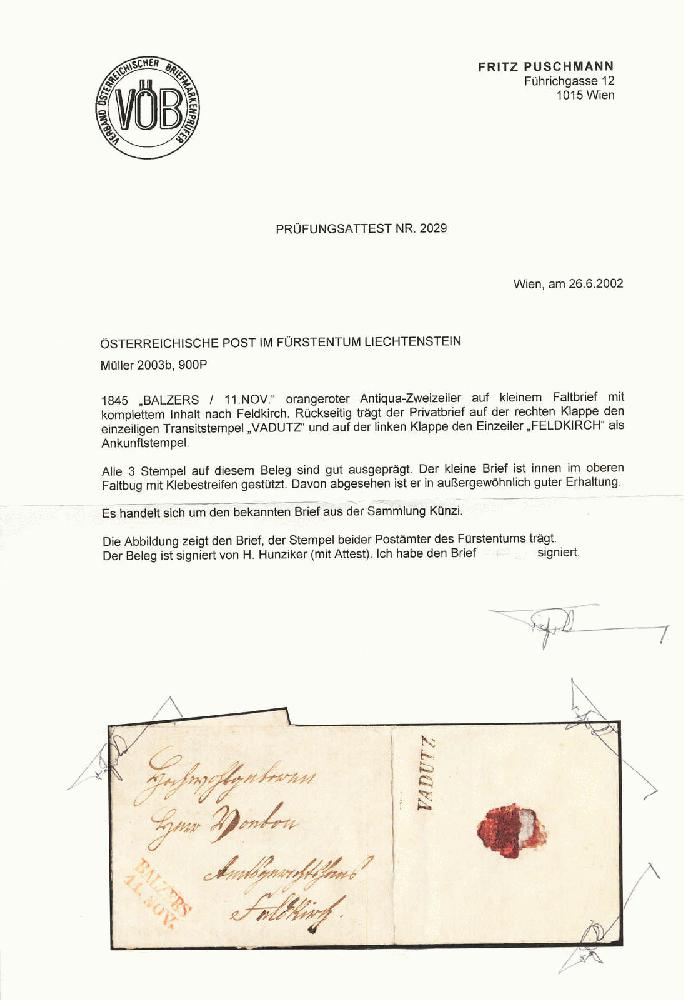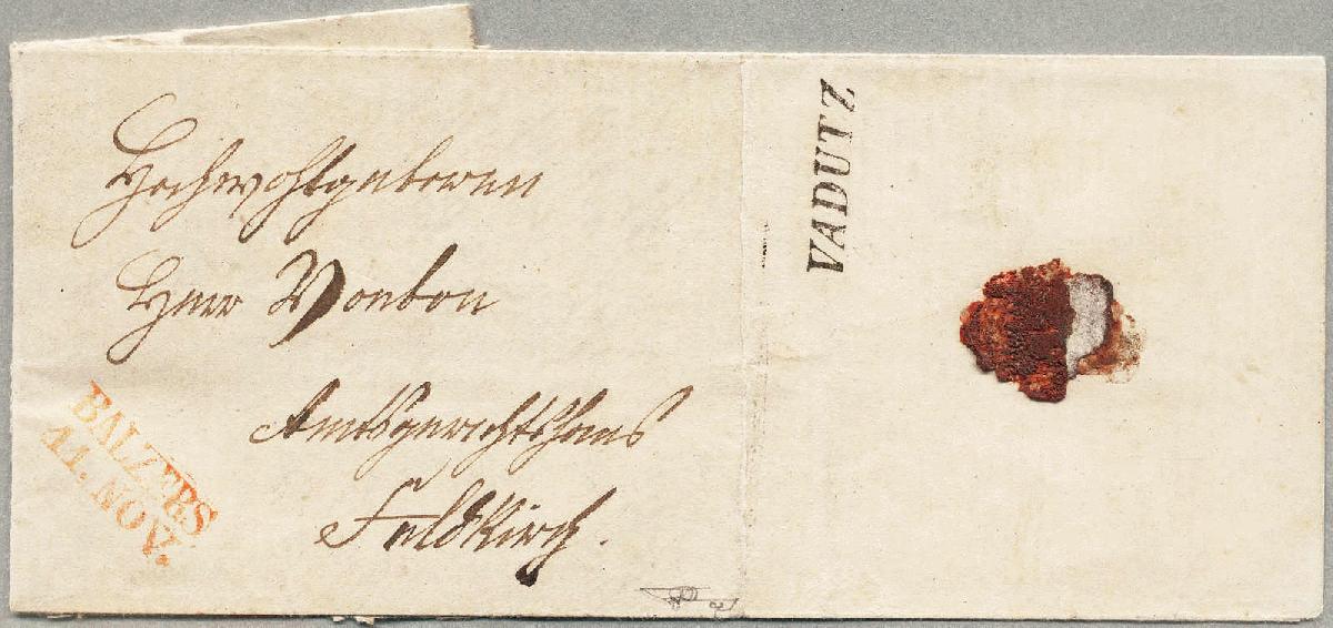 | Zusatzinformationen und Suchstichworte: | 11. classicphil GmbH Auktion Auktionstermin: 28. Mai 2022 Los 1054 Liechtenstein1845, Brief mit vollem Inhalt von BALZERS nach FELDKIRCH, vorderseitig wurde der Brief mit dem orangeroten Antiqua Zweizeiler BALZERS 11. NOV, rückseitig trägt der Privatbrief auf der rechten Klappe den Transitstempel VADUZ und auf der linken Klappe den Einzeiler FELDKIRCH als Ankunftsstempel, ex Künzi, Attest Puschmann, Prüfmitteilung VSPV, außergewöhnliche Erhaltung dieses unikalen Beleges! Schätzpreis 12.000€. Ausruf 2.800,00 EUR |