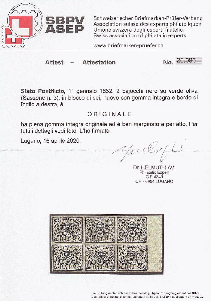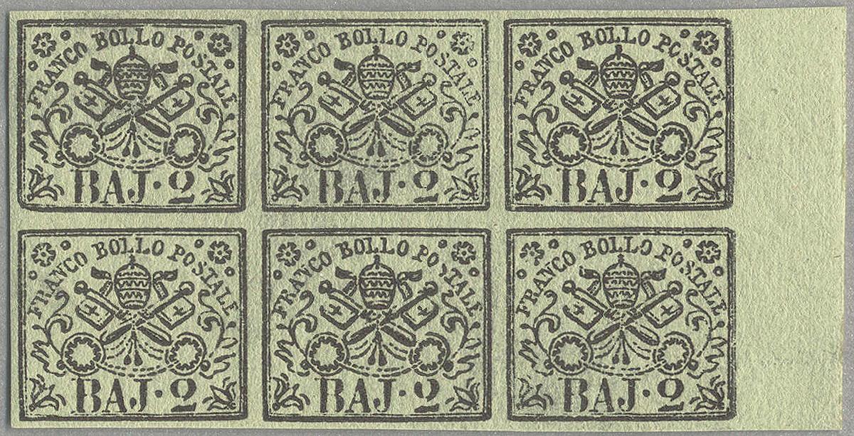 | Zusatzinformationen und Suchstichworte: | 11. classicphil GmbH Auktion Auktionstermin: 28. Mai 2022 Los 1061 Italien Staaten Kirchenstaat 1852,2 Baj, verde oliva (schwarz auf oliv), ungezähnt Sechserblock, postfrisch mit vollem Originalgummi, richtigem Seite Seitenrandstück mit guten bis breiten Rändern, eine herausragende Rarität von dieser große Einheit in ausgezeichnet Frische, für den fortgeschrittenen Sammler, Attest Rayboudi und Avi, CV 13200 + + €, SUP! Schätzpreis 13,200 EUR. Ausruf 1.500,00 EUR |