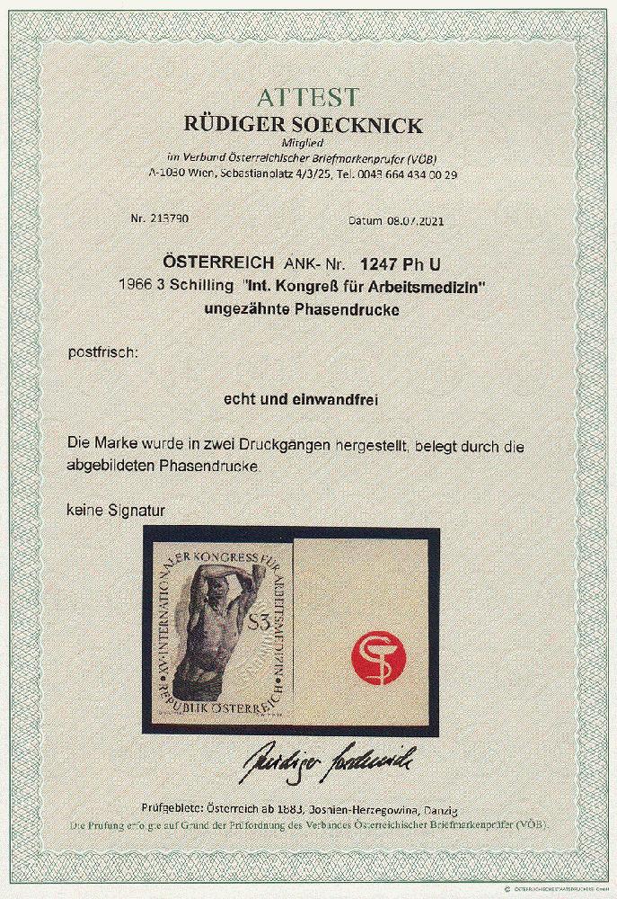 | Zusatzinformationen und Suchstichworte: | 11. Auktion Stilus Auktionstermin: 5. Juni 2022 Los 3 Österreich 2. Republik Österreich, 1966, ANK-Nr.: 1247 Ph U (Michel-Nr.: 1217), 'XV. Internationaler Kongress für Arbeitsmedizin', 3 Schilling, ungezähnte Phasendrucke (2), postfrisch **, einwandfreie Erhaltung, Attest Soecknick VÖB Ausruf 100,00 EUR |