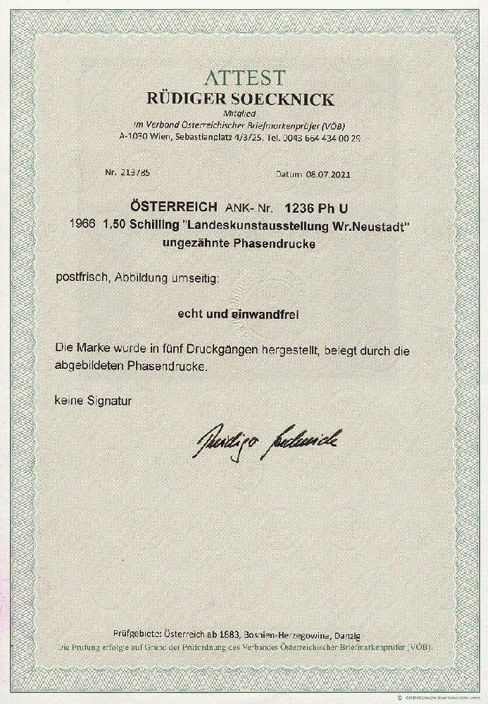 | Zusatzinformationen und Suchstichworte: | 11. Auktion Stilus Auktionstermin: 5. Juni 2022 Los 1 Österreich 2. Republik Österreich, 1966, ANK-Nr.: 1236 Ph U (Michel-Nr.: 1206), 'Landeskunstausstellung - Wiener Neustadt 1440 - 1493', 1,5 Schilling, ungezähnte Phasendrucke (5), postfrisch **, einwandfreie Erhaltung, Attest Soecknick VÖB Zuschlag 100,00 EUR |