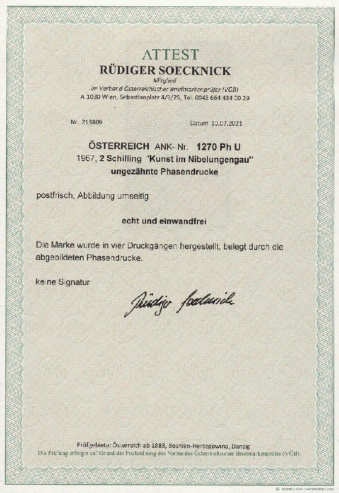 | Zusatzinformationen und Suchstichworte: | 11. Auktion Stilus Auktionstermin: 5. Juni 2022 Los 9 Österreich 2. Republik Österreich, 1967, ANK-Nr.: 1270 Ph U (Michel-Nr.: 1240), 'Kunst im Nibelungengau, Pöchlarn 1967', 2 Schilling, ungezähnte Phasendrucke (4), postfrisch **, einwandfreie Erhaltung, Attest Soecknick VÖB Ausruf 100,00 EUR |