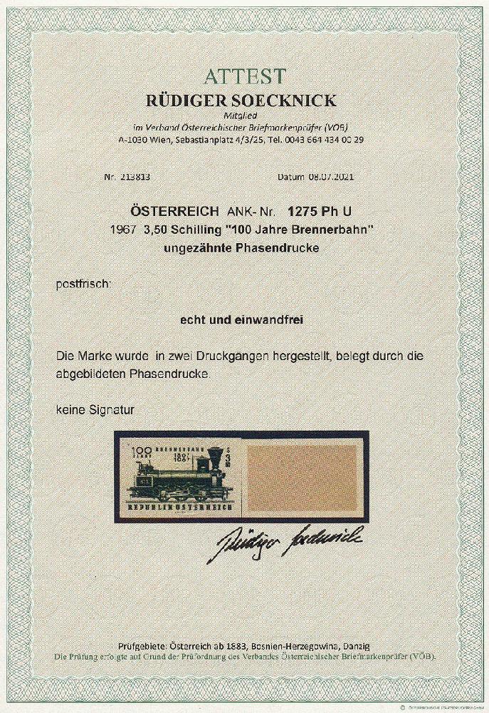 | Zusatzinformationen und Suchstichworte: | 11. Auktion Stilus Auktionstermin: 5. Juni 2022 Los 10 Österreich 2. Republik Österreich, 1967, ANK-Nr.: 1275 Ph U (Michel-Nr.: 1245), '100 Jahre Brennerbahn', 3,5 Schilling, ungezähnte Phasendrucke (2), postfrisch **, einwandfreie Erhaltung, Attest Soecknick VÖB Ausruf 100,00 EUR |