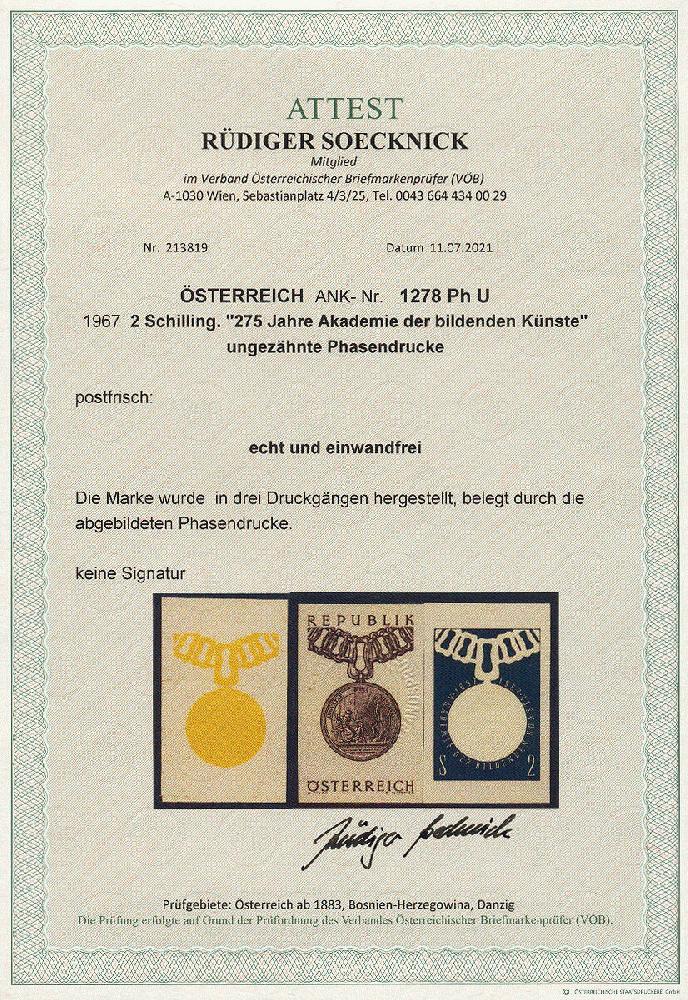 | Zusatzinformationen und Suchstichworte: | 11. Auktion Stilus Auktionstermin: 5. Juni 2022 Los 13 Österreich 2. Republik Österreich, 1967, ANK-Nr.: 1278 Ph U (Michel-Nr.: 1248), '275 Jahre Akademie der bildenden Künste', 2 Schilling, ungezähnte Phasendrucke (3), postfrisch **, einwandfreie Erhaltung, Attest Soecknick VÖB Ausruf 100,00 EUR |