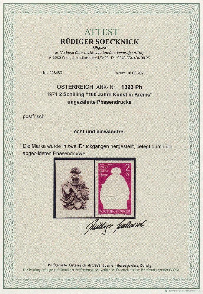 | Zusatzinformationen und Suchstichworte: | 11. Auktion Stilus Auktionstermin: 5. Juni 2022 Los 38 Österreich 2. Republik Österreich, 1971, ANK-Nr.: 1393 Ph U (Michel-Nr.: 1363), '1000 Jahre Kunst in Krems', 2 Schilling, ungezähnte Phasendrucke (2), postfrisch **, einwandfreie Erhaltung, Attest Soecknick VÖB Ausruf 100,00 EUR |