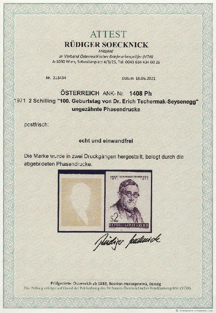 | Zusatzinformationen und Suchstichworte: | 11. Auktion Stilus Auktionstermin: 5. Juni 2022 Los 43 Österreich 2. Republik Österreich, 1971, ANK-Nr.: 1408 Ph U (Michel-Nr.: 1378), '100. Geburtstag von Dr. Erich, Tschermak-Seysenegg', 2 Schilling, ungezähnte Phasendrucke (2), postfrisch **, einwandfreie Erhaltung, Attest Soecknick VÖB Ausruf 100,00 EUR |