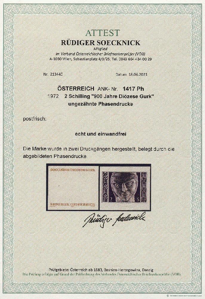 | Zusatzinformationen und Suchstichworte: | 11. Auktion Stilus Auktionstermin: 5. Juni 2022 Los 46 Österreich 2. Republik Österreich, 1972, ANK-Nr.: 1417 Ph U (Michel-Nr.: 1387), '900 Jahre Diözese Gurk', 2 Schilling, ungezähnte Phasendrucke (2), postfrisch **, einwandfreie Erhaltung, Attest Soecknick VÖB Ausruf 100,00 EUR |