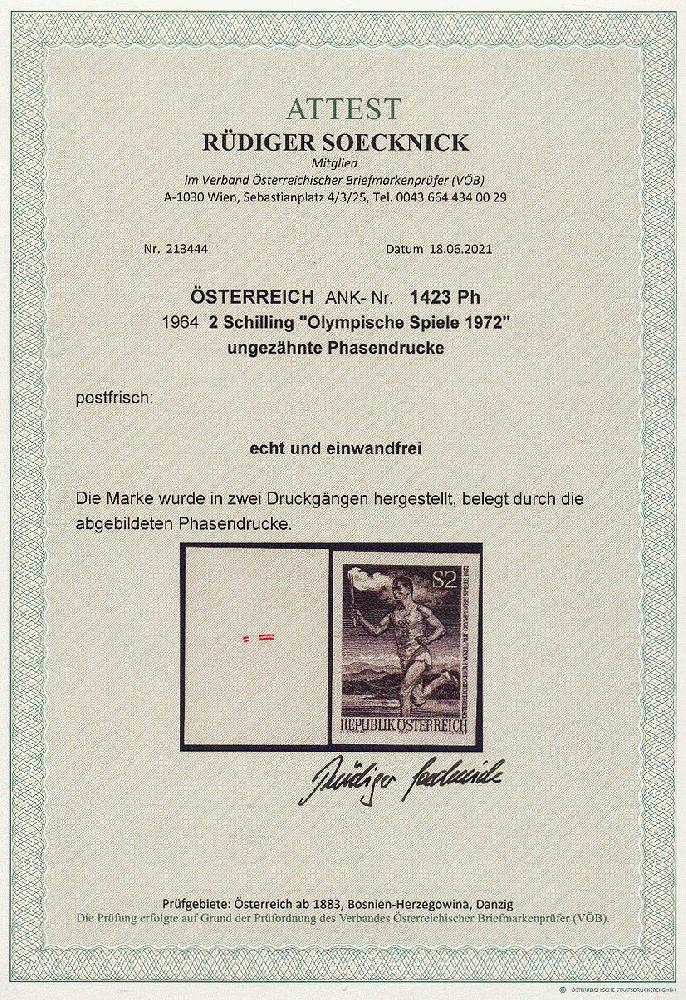 | Zusatzinformationen und Suchstichworte: | 11. Auktion Stilus Auktionstermin: 5. Juni 2022 Los 48 Österreich 2. Republik Österreich, 1972, ANK-Nr.: 1423 Ph U (Michel-Nr.: 1392), 'Österreichischer Fackellauf - Olympische Spiele 1972', 2 Schilling, ungezähnte Phasendrucke (2), postfrisch **, einwandfreie Erhaltung, Attest Soecknick VÖB Zuschlag 100,00 EUR |