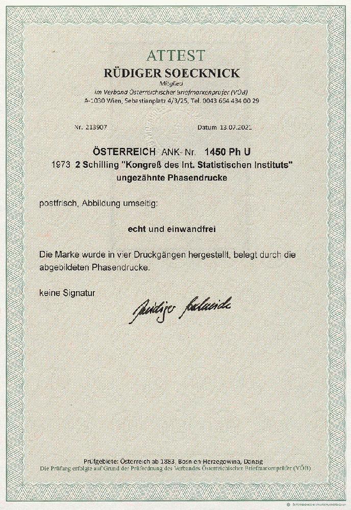 | Zusatzinformationen und Suchstichworte: | 11. Auktion Stilus Auktionstermin: 5. Juni 2022 Los 54 Österreich 2. Republik Österreich, 1973, ANK-Nr.: 1450 Ph U (Michel-Nr.: 1420), '39. Kongress des Internationalen Statistischen Instituts', 2 Schilling, ungezähnte Phasendrucke (4), postfrisch **, einwandfreie Erhaltung, Attest Soecknick VÖB Ausruf 100,00 EUR |