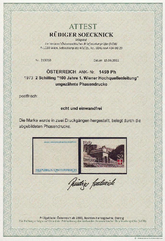 | Zusatzinformationen und Suchstichworte: | 11. Auktion Stilus Auktionstermin: 5. Juni 2022 Los 55 Österreich 2. Republik Österreich, 1973, ANK-Nr.: 1459 Ph U (Michel-Nr.: 1429), '100 Jahre 1. Wiener Hochquellenleitung', 2 Schilling, ungezähnte Phasendrucke (2), postfrisch **, einwandfreie Erhaltung, Attest Soecknick VÖB Ausruf 100,00 EUR |