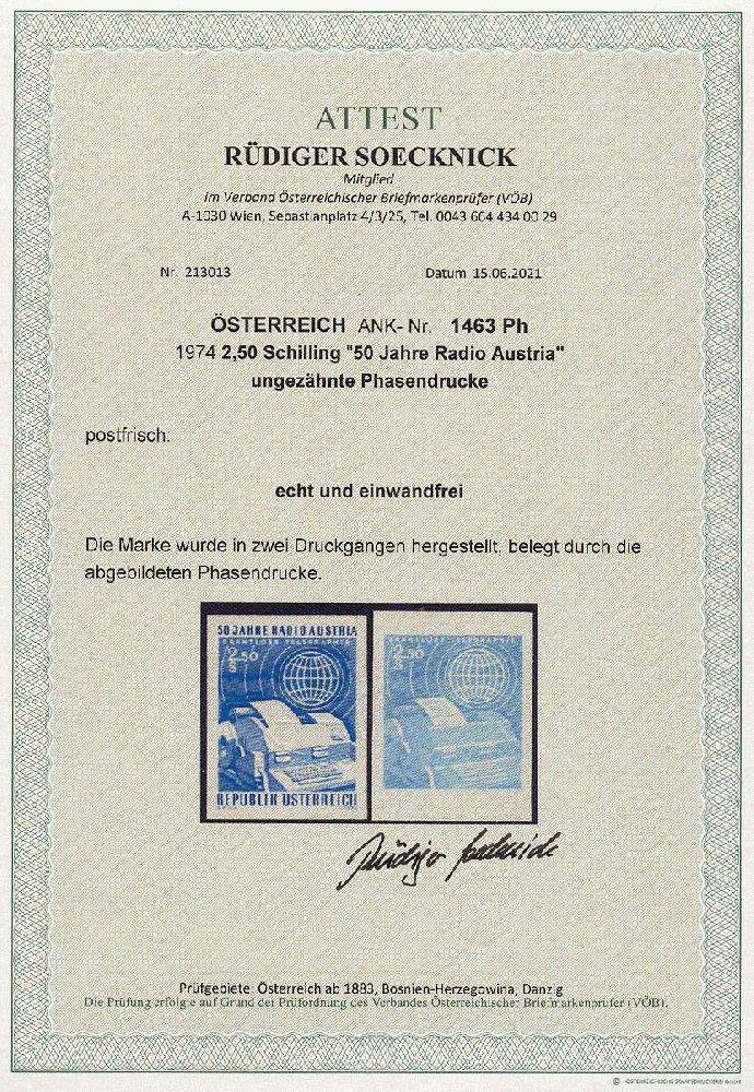 | Zusatzinformationen und Suchstichworte: | 11. Auktion Stilus Auktionstermin: 5. Juni 2022 Los 56 Österreich 2. Republik Österreich, 1974, ANK-Nr.: 1463 Ph U (Michel-Nr.: 1437), '50 Jahre Radio Austria', 2,5 Schilling, ungezähnte Phasendrucke (2), postfrisch **, einwandfreie Erhaltung, Attest Soecknick VÖB Ausruf 100,00 EUR |