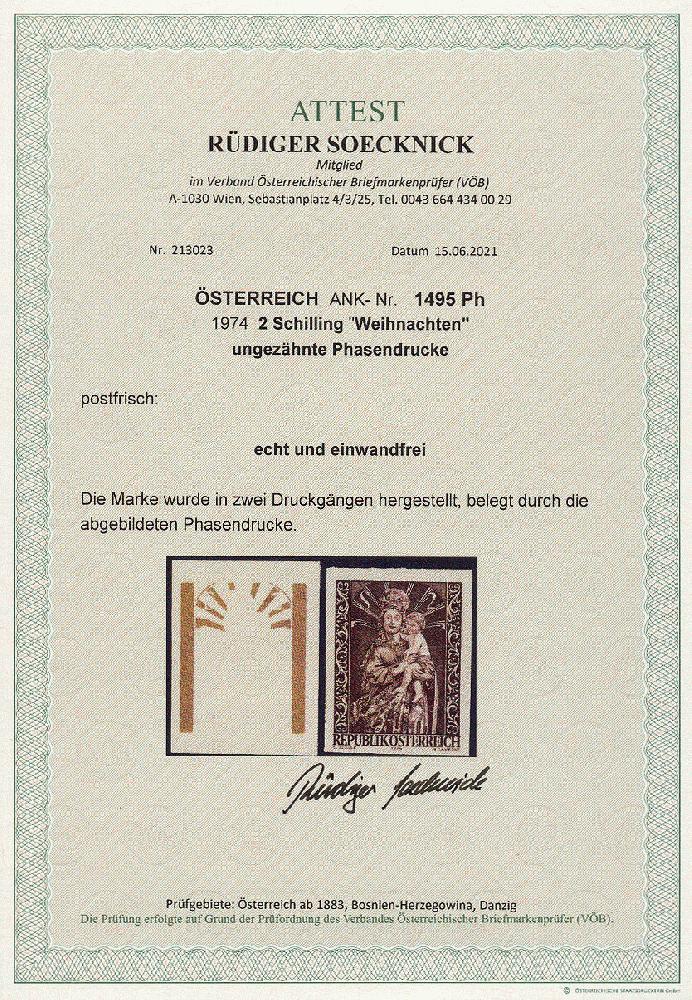 | Zusatzinformationen und Suchstichworte: | 11. Auktion Stilus Auktionstermin: 5. Juni 2022 Los 62 Österreich 2. Republik Österreich, 1974, ANK-Nr.: 1495 Ph U (Michel-Nr.: 1472), 'Weihnachten 1974', 2 Schilling, ungezähnte Phasendrucke (2), postfrisch **, einwandfreie Erhaltung, Attest Soecknick VÖB Ausruf 100,00 EUR |