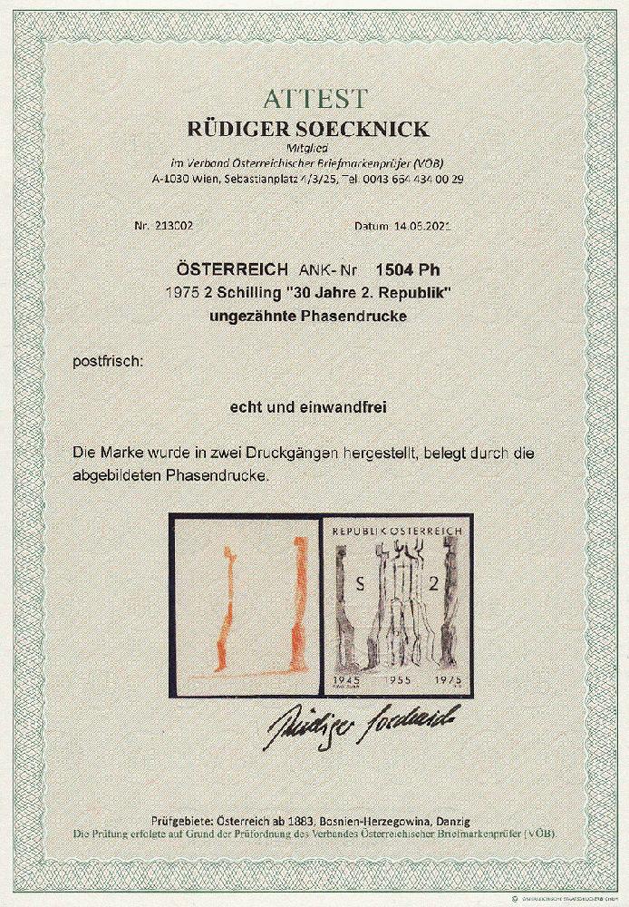 | Zusatzinformationen und Suchstichworte: | 11. Auktion Stilus Auktionstermin: 5. Juni 2022 Los 66 Österreich 2. Republik Österreich, 1975, ANK-Nr.: 1504 Ph U (Michel-Nr.: 1485), '30 Jahre Zweite Republik', 2 Schilling, ungezähnte Phasendrucke (2), postfrisch **, einwandfreie Erhaltung, Attest Soecknick VÖB Ausruf 100,00 EUR |