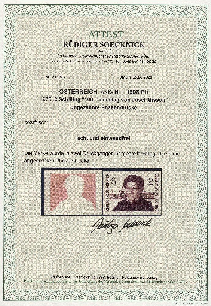 | Zusatzinformationen und Suchstichworte: | 11. Auktion Stilus Auktionstermin: 5. Juni 2022 Los 67 Österreich 2. Republik Österreich, 1975, ANK-Nr.: 1508 Ph U (Michel-Nr.: 1489), '100. Todestag von Josef Misson', 2 Schilling, ungezähnte Phasendrucke (2), postfrisch **, einwandfreie Erhaltung, Attest Soecknick VÖB Ausruf 100,00 EUR |