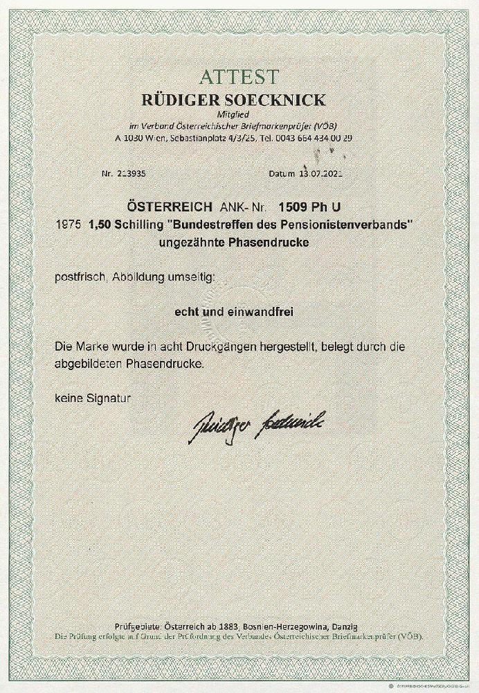 | Zusatzinformationen und Suchstichworte: | 11. Auktion Stilus Auktionstermin: 5. Juni 2022 Los 68 Österreich 2. Republik Österreich, 1975, ANK-Nr.: 1509 Ph U (Michel-Nr.: 1490), 'Bundestreffen des Österr. Pensionistenverbandes', 1,5 Schilling, ungezähnte Phasendrucke (8), postfrisch **, einwandfreie Erhaltung, Attest Soecknick VÖB Ausruf 100,00 EUR |