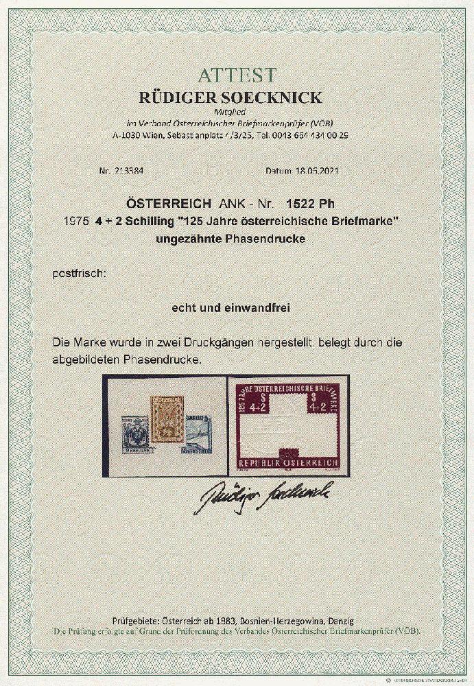 | Zusatzinformationen und Suchstichworte: | 11. Auktion Stilus Auktionstermin: 5. Juni 2022 Los 72 Österreich 2. Republik Österreich, 1975, ANK-Nr.: 1522 Ph U (Michel-Nr.: 1504), '125 Jahre Österreichische Briefmarke', 4 + 2 Schilling, ungezähnte Phasendrucke (2), postfrisch **, einwandfreie Erhaltung, Attest Soecknick VÖB Zuschlag 100,00 EUR |